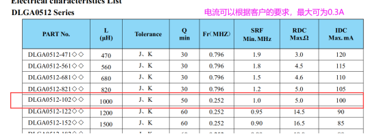 客戶原先使用的是B82144A2105J色環(huán)電感,這款電感對(duì)應(yīng)谷景的DLGA0512-102JTB,在參數(shù)上,TDK的電流只能做到0.2A,谷景的可以做到0.3A。